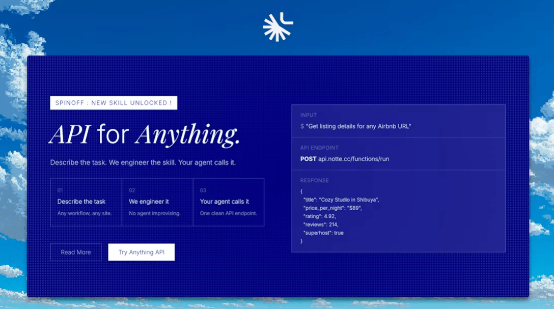 Many websites don't have public APIs. Anything API fills that gap. Turn any browser work into a production-ready API. Describe the task, and our agents build a custom function that calls the site directly. Ship a custom API endpoint you can deploy serverless, schedule on Cron, or call via API. Tell Notte what you need. We ship the function endpoint.