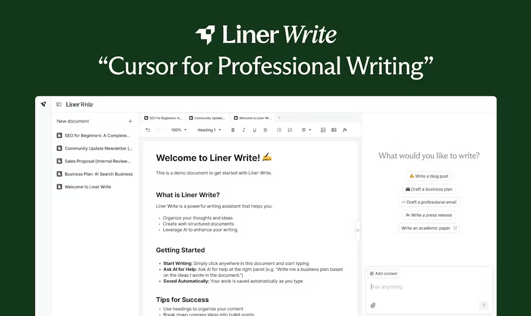 Liner Write is a Cursor-style writing agent for professional documents. Co-write business plans, proposals, reports, and more with an AI backed by the world's most accurate search (Liner Deep Research, 95%+ on SimpleQA). World-class output. Near-zero hallucinations.