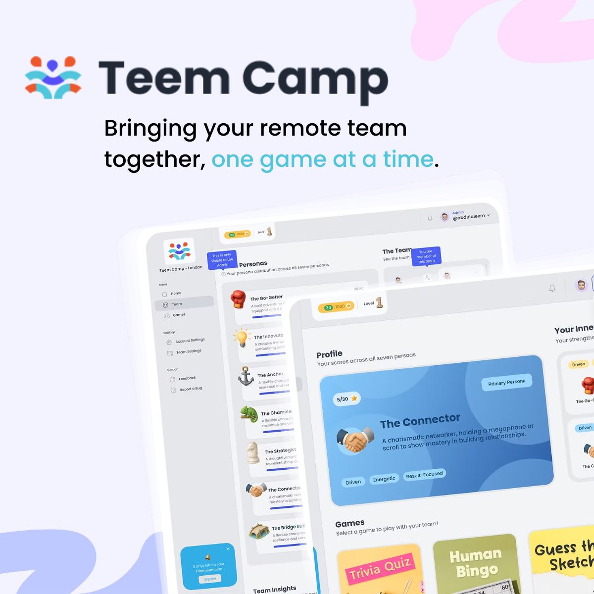 Teem Camp is the Remote Team Culture OS, the only platform that evolves with your team, where you get engaging team-building sessions that improve engagement, retention and morale.
