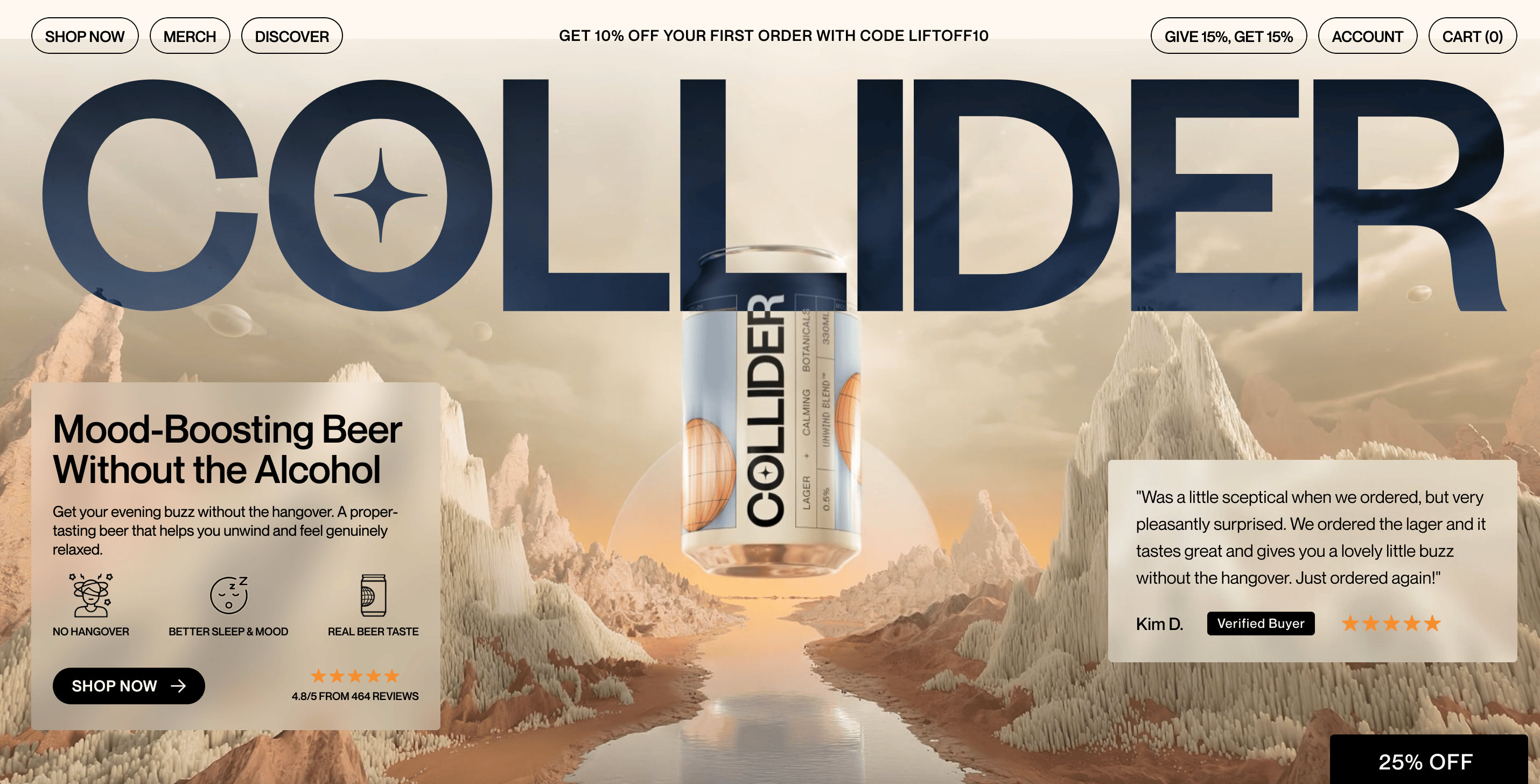 Founded by Harry, Collider is a non-alcoholic beer brand infused with functional botanicals designed to help people unwind without alcohol. The idea behind the product is simple: beer first, function built in.